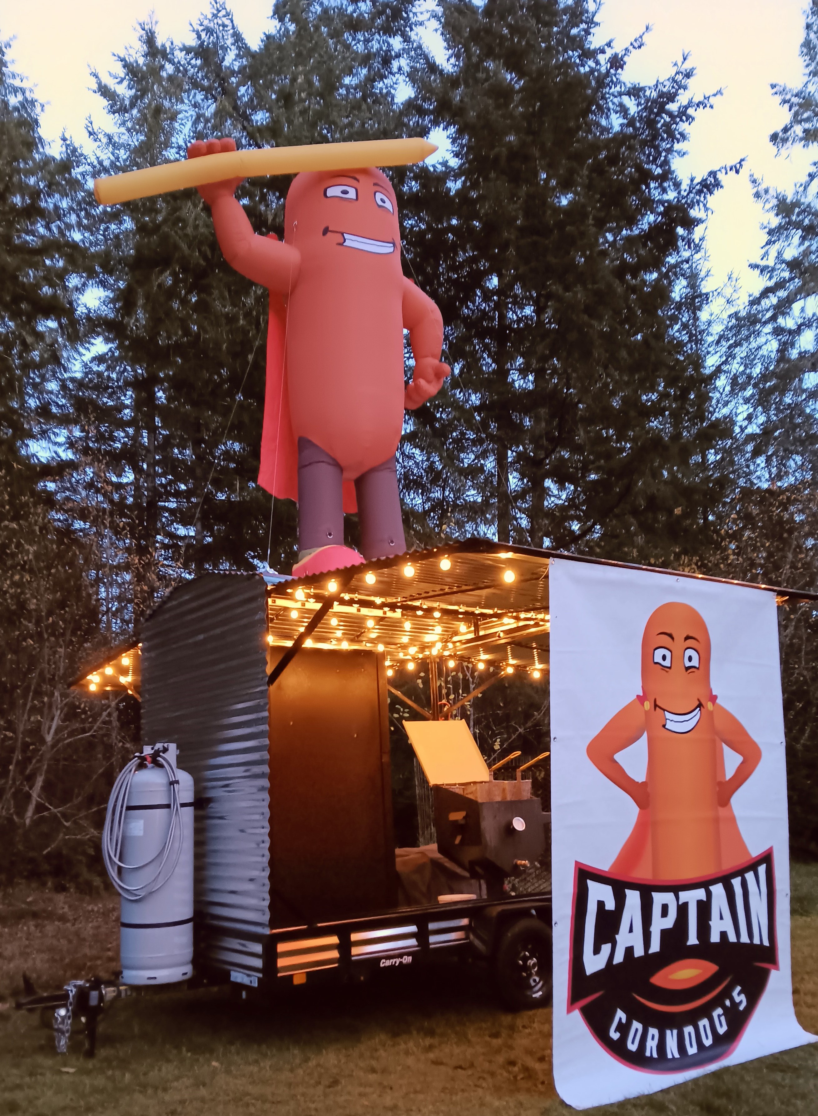 This sentient flying corndog creature commands food carts in Mason County, and at events throughout Washington State. He seldom makes personal appearances, as he has been bitten in the past. Regardless, he still maintains a personal commitment to feed the people delicious deep-fried treats, and stamp-out hunger throughout the land...